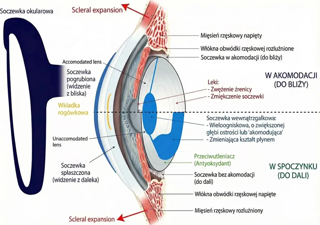- Warto wiedzieć: Istnieje zjawisko zwane pseudoakomodacją. Opisuje ono sytuację, w której osoba starsza nadal widzi z bliska mimo braku rzeczywistej akomodacji soczewki (np. dzięki głębi ostrości przy wąskiej źrenicy).
